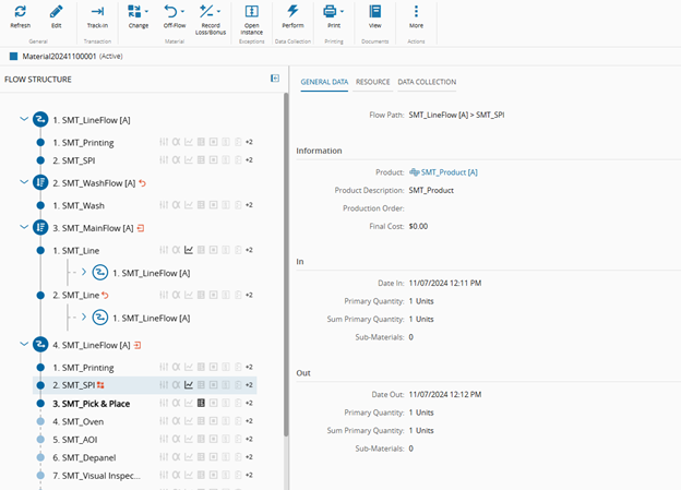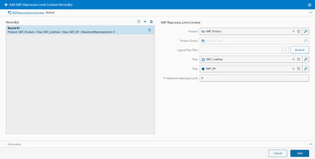 Lets assume that a user wants to define that every PCB (material) from the Product "SMT_Product" can only be processed 1 time at the SMT_SPI step. This means, reprocess is not allowed at the SMT_SPI step. Once this limit is reached by a given PCB, it will not be allowed to be reprocessed (tracked in/out) at that step anymore.