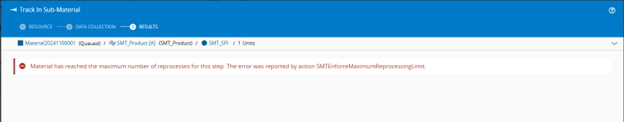 ... if we want to process that exact material once again at the SMT_SPI step, the system will not allow it because we defined the reprocess limit for that step as 0.