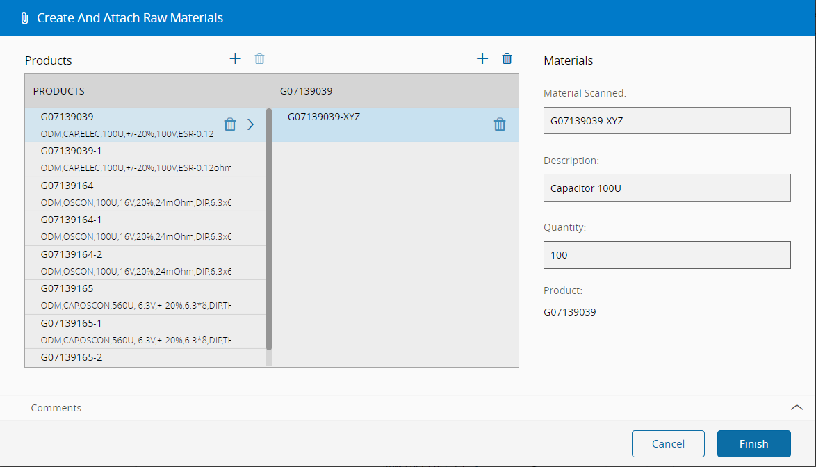 The list of BOM products for the materials consumed on this step will be presented. The materials for these products can now be scanned and automatically created. Select the product and scan the label. Information retrieved from scanning, Material Scanned, Description and Quantity will be presented on the input text boxes:
