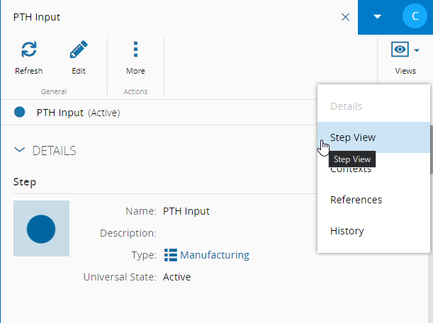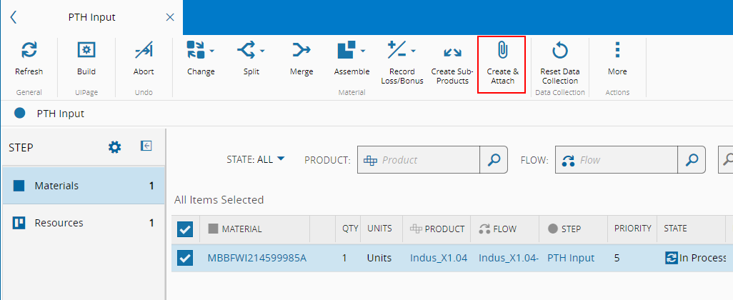 To scan, create and attach a raw material go to the step view of the step where the materials are going to be assembled. The PTH Input step is going to be used in the following example: